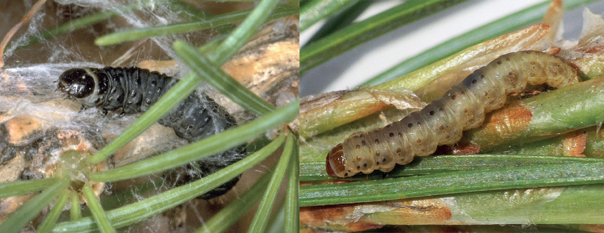Abb. 2. Die grauschwarzen Raupen der Lärchenform (links) ernähren sich fast ausschliesslich von Lärchennadeln. Die gelblichgrauen Raupen der Arvenform (rechts) fressen vor allem an den neuen Trieben der Arve, kommen aber auch auf Lärchen, Föhren oder Fichten vor. Fotos: Beat Wermelinger und Beat Forster (WSL)