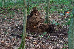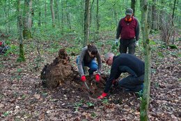 Wie mit dem Zirkel gezogen sind viele Stubben eines rund 60-jährigen Roteichenbestands im Freiburger Mooswald bis zu den Wurzeln umgegraben. Die Täter sind schnell identifiziert: Wildschweine haben im Boden rund um die vermodernden Roteichenstubben Nahrung ausfindig gemacht. Den Hinweis, dass sich hier etwas Besonderes im Boden befindet, erhielt die FVA schon 2011 im Rahmen der Erstellung des Managementplans für das FFH-Gebiet "Mooswälder bei Freiburg".