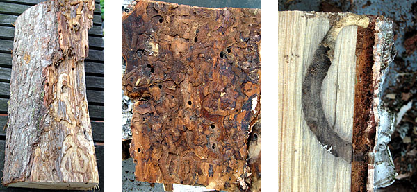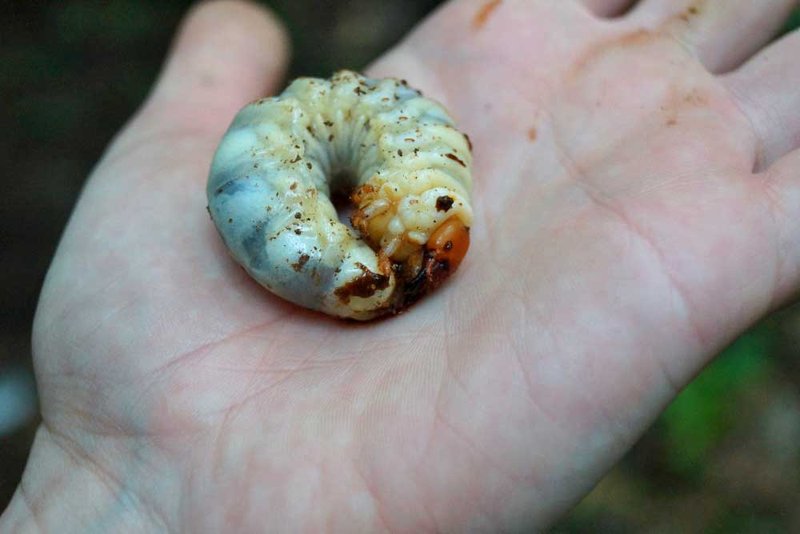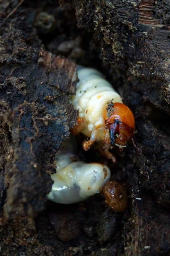 Abb. 3: L3-Larve des Hirschkäfers im Fraßgang durch verpilztes Roteichen-Holz.