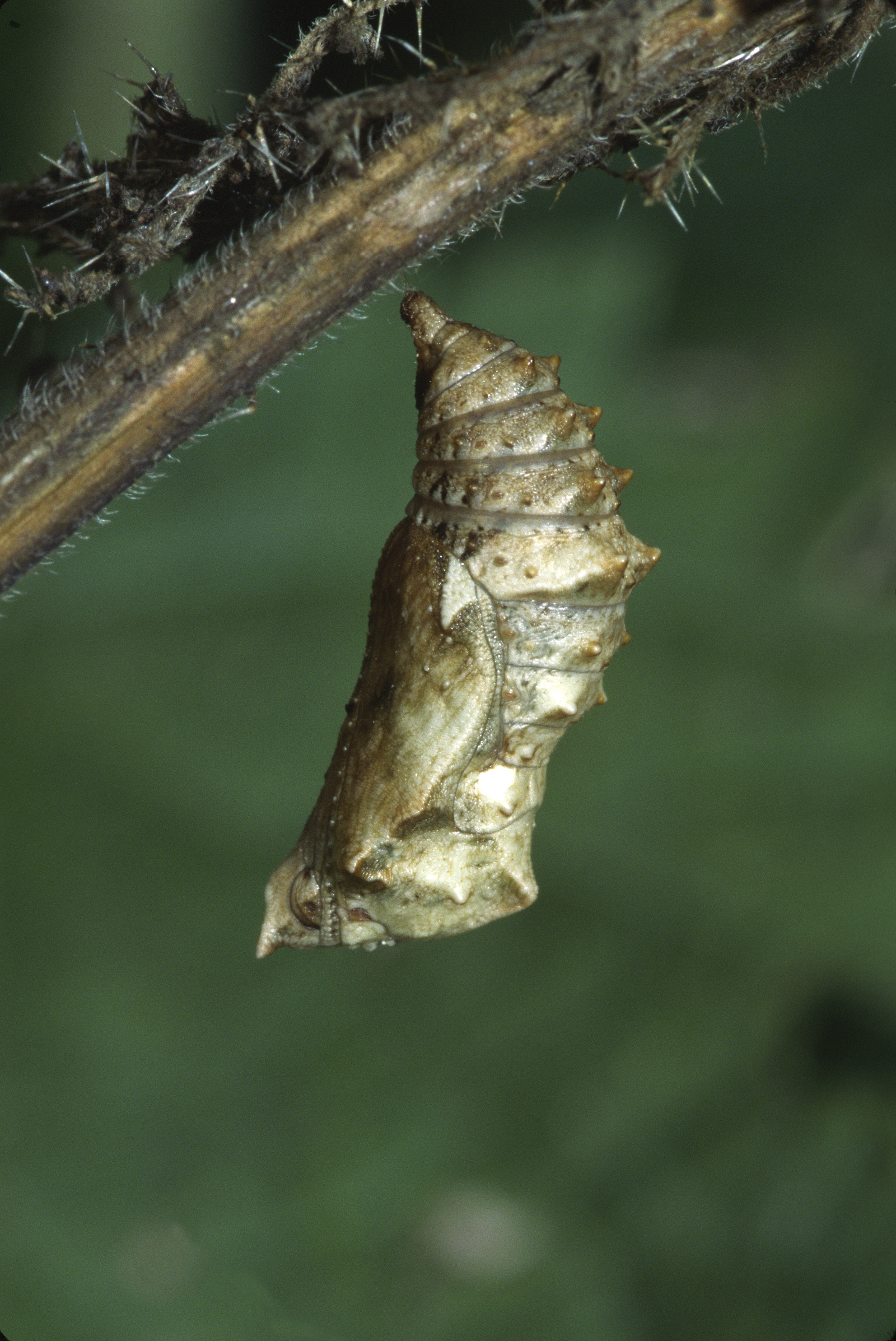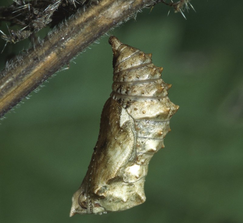 Puppen – ein seltener Anblick: Die Puppen sitzen an der Großen Brennnessel. Sie sind meist braun und weisen spitze Erhebungen auf. Die Puppen der letzten Generation überwintern. Aus dem Freiland sind nur wenige Puppenfunde bekannt. Dabei handelte es sich meist um Einzelfunde, was verwundert, da die Raupen vor der Verpuppung doch sehr zahlreich an einer Brennnessel zusammenlebten.