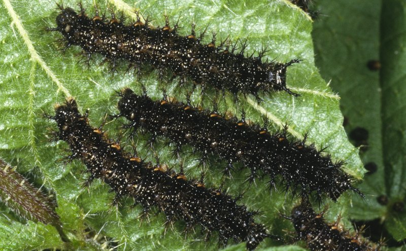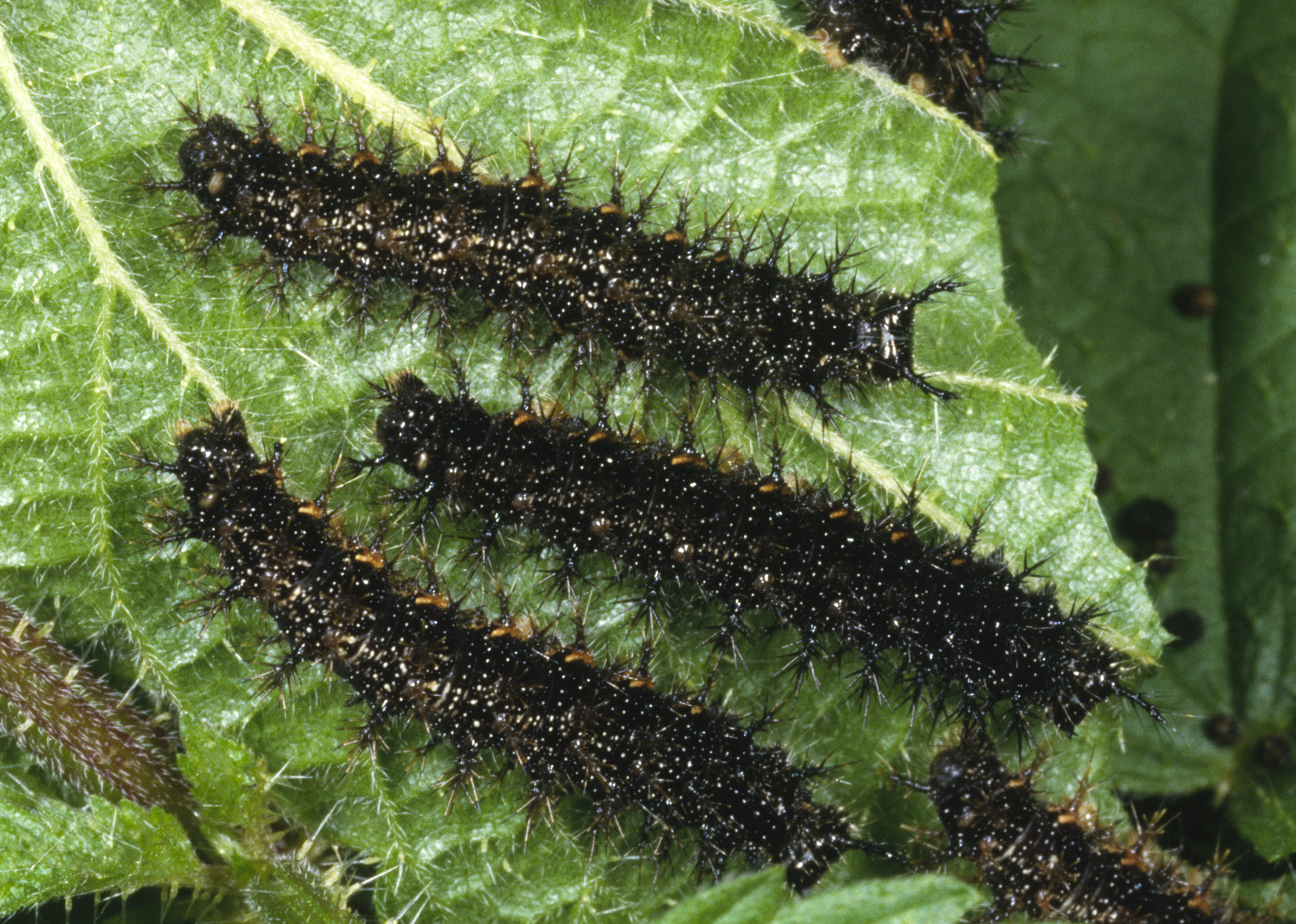 Raupen mit Dornen: Die Raupen ernähren sich von der Großen Brennnessel und leben sehr gesellig zusammen. Sie sind vorwiegend schwarz und tragen an jedem Segment verzweigte Dornenpaare. Ab dem zweiten Larvenstadium (L2) bildet sich ein Dornenpaar auf dem Kopf der Raupe aus, womit sie sich von der leicht zu verwechselnden Raupe des Tagpfauenauges (Aglais io) unterscheidet.
