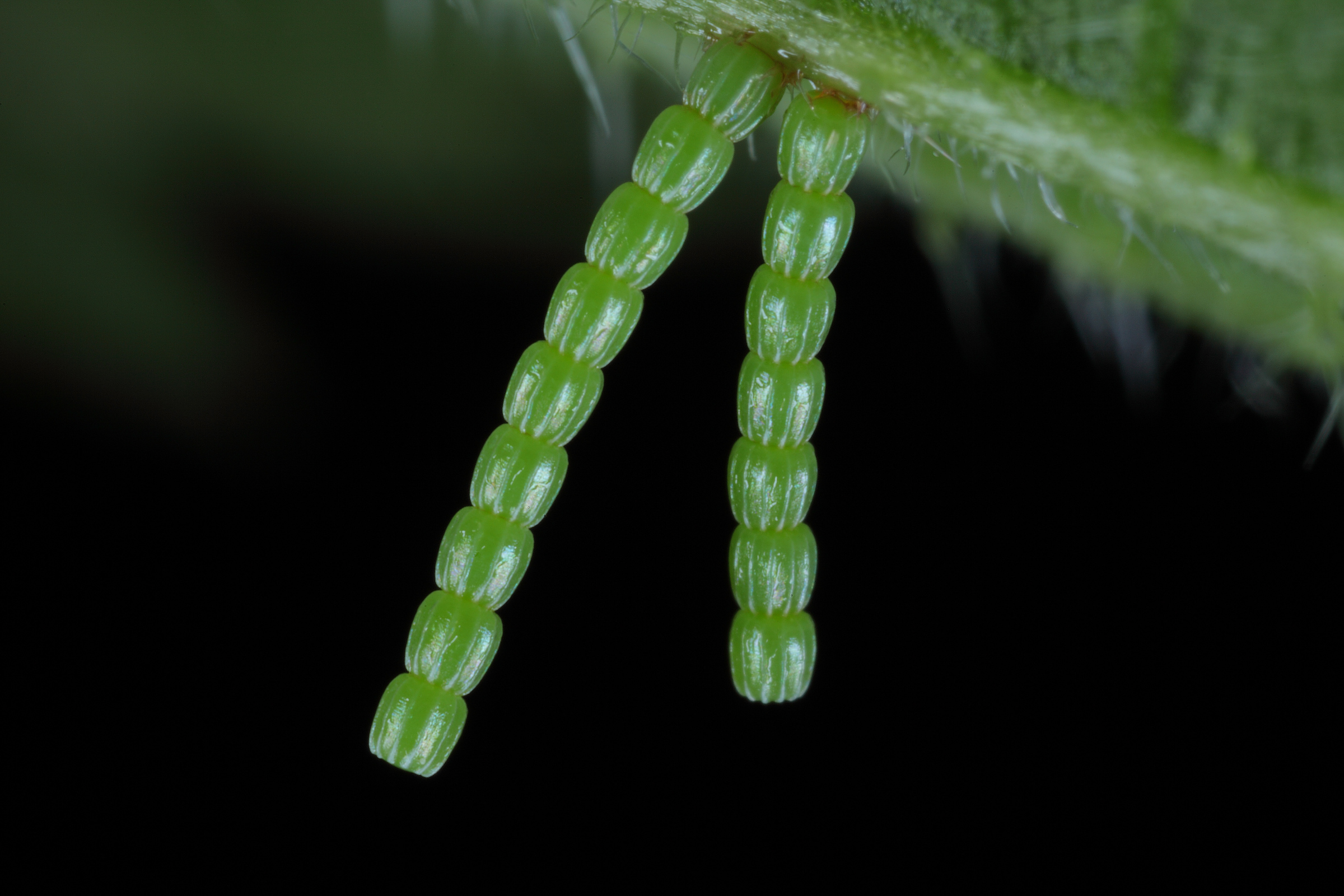 Eigelege von besonderer Gestalt: Die Eier werden bevorzugt an der Großen Brennnessel abgelegt, dazu muss diese jedoch luftfeucht und eher schattig stehen. Die einzigartigen Eigelege klebt das Falterweibchen auf der Blattunterseite zu nach unten hängenden, grünen Türmchen aneinander. Die Larven schlüpfen dann seitlich aus den Eiern.