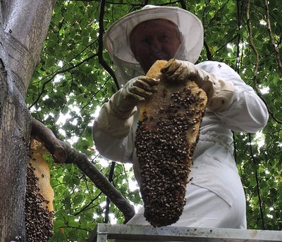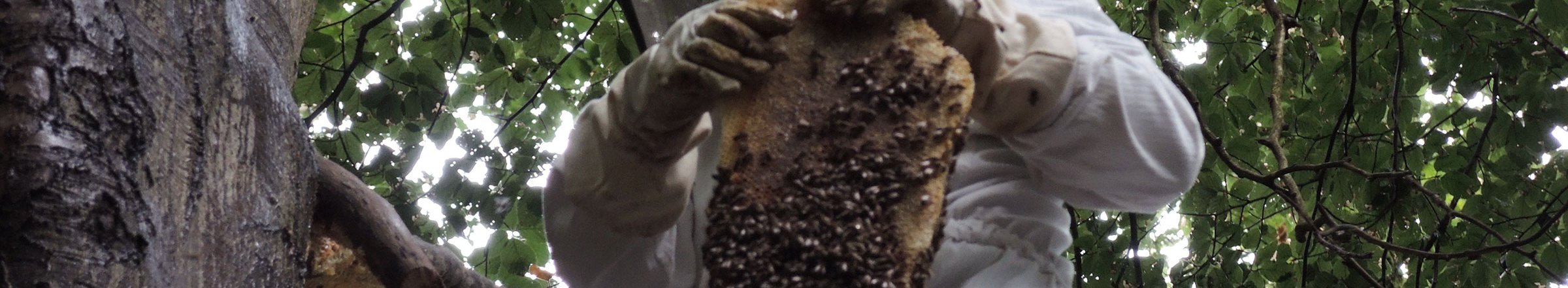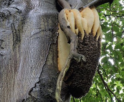 Was brummt denn da so? Unser Waldbesucher stutzt. Ein solches Geräusch hat er auf seinen Spaziergängen hier im Forst noch nie gehört. Er schaut sich gründlich um, kneift die Augen zusammen – nichts. Er legt den Kopf in den Nacken, blickt steil nach oben, blinzelt, da sieht er was. Was er dort entdeckt, ist eine kleine Sensation. Er schaut genauer hin. In etwa acht Metern Höhe erkennt er eine dicke Traube von bräunlicher Färbung, zerschnitten von seltsam anmutenden gelblichen Scheiben, lotrecht aufgehängt. Was kann denn das wohl sein? Er überlegt kurz, rät dann richtig und wählt die Nummer des ortsansässigen Imkervereins.