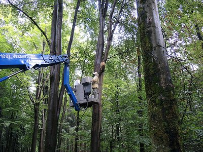 Die Imker kommen ausgerüstet mit allem, was man zum Schwärmefangen benötigt. Auch die mitgebrachte Hebebühne erweist sich bei dieser Höhe als sehr nützlich. Letztendlich gelingt die Luftrettung und das Bienenvolk hält in einem Bienenkasten Einzug.