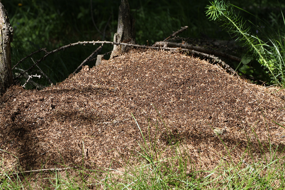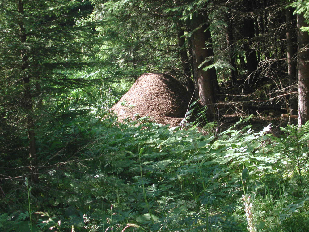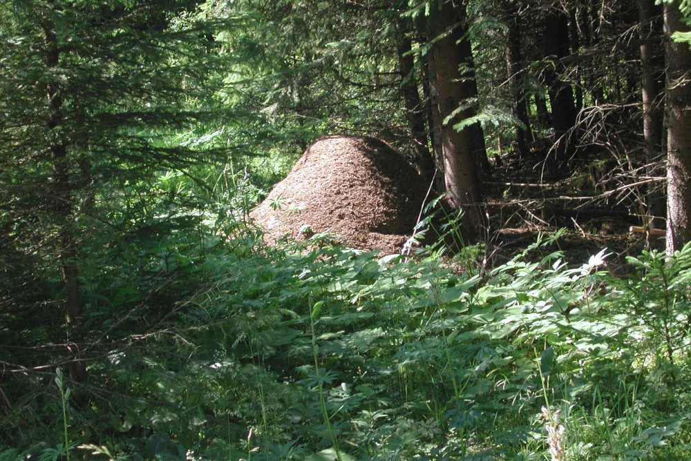 Abb. 1: Die Nester der staatenbildenden Roten Waldameisen bestehen aus einem unterirdischen Erdnest und der auffälligen, zuweilen riesigen Nestkuppel. Bevorzugte Standorte von Waldameisenhaufen sind sonnige Stellen in Wäldern mit hohem Nadelholzanteil und dichter Bodenvegetation. Foto: Beat Wermelinger