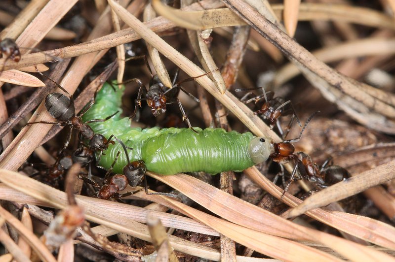 Abb. 9: Eine Gruppe von Waldameisen trägt eine erbeutete Blattwespenraupe ins Nest. Foto: Beat Wermelinger (WSL)