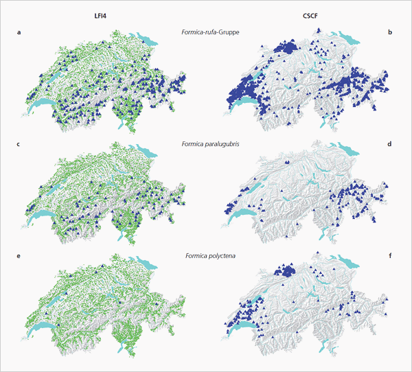 Forschende der WSL haben nun anhand dieser Daten sowie unter Einbezug von kantonalen Ameiseninventuren und einzelnen Beobachtungsmeldungen für die ganze Schweiz flächendeckend berechnet, wo die fünf waldbewohnenenden Arten der Roten Waldameisen potenziell vorkommen könnten. Die daraus entstandenen Karten sind auf der Website des LFI zu finden und illustrieren die mögliche Verbreitung der Grossen Roten Waldameise (Abb. 10, Formica rufa), der Kahlrückigen Waldameise (Formica polyctena), der Schweizer Gebirgswaldameise (Formica paralugubris), der Starkbeborsteten Gebirgswaldameise (Formica lugubris) und der Schwachbeborsteten Gebirgswaldameise (Formica aquilonia).