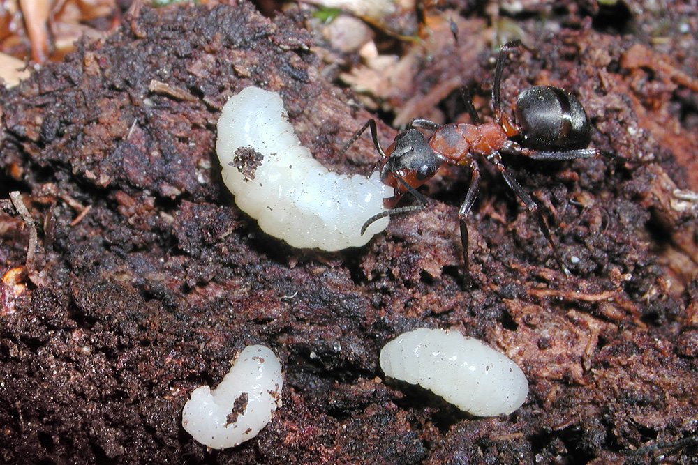 Die Biologie der verschiedenen Waldameisenarten wurde vor allem für die Grosse Rote Waldameise und die Kahlrückige Waldameise umfassend untersucht: Aus den von der Königin im Nest abgelegten Eiern schlüpfen nach zwei Wochen die Larven (Abb. 2). Diese entwickeln sich über vier Larvenstadien während rund zwei Wochen im Nestinnern und verpuppen sich anschliessend. Nach weiteren zwei Wochen schlüpfen die adulten Ameisen.