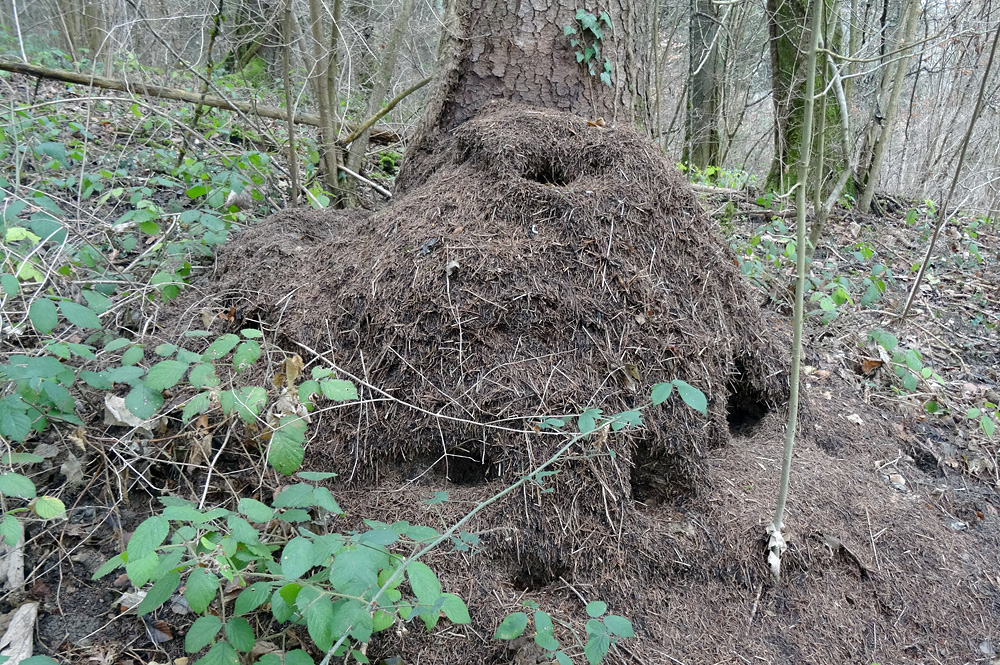 Abb. 7: Auf der Suche nach nahrhafter Ameisenbrut haben Spechte dieses Ameisennest stark in Mitleidenschaft gezogen. Foto: Anne Freitag
