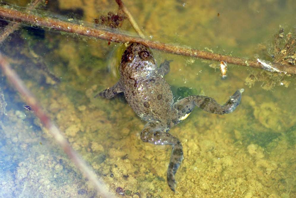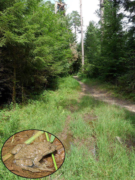 Abb. 8 - Gelbbauchunken pflanzen sich in kleinsten Gewässern fort. Mit Wasser gefüllte Fahrspuren im Wald sind für sie ein wichtiger Ersatzlebensraum. Foto: Thomas Reich (WSL)