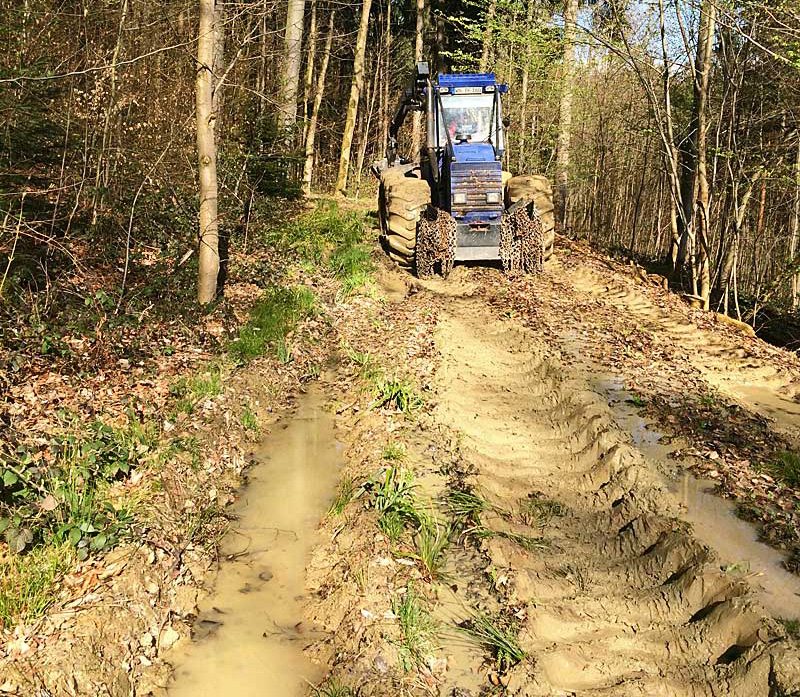 Im Interessenkonflikt zwischen Boden- und Artenschutz sollte man sich auf einen Kompromiss einigen: bereits entstandene Fahrspuren dulden, solange sie die Waldbewirtschaftung nicht übermässig behindern.