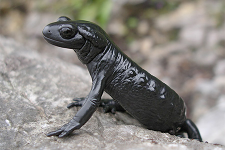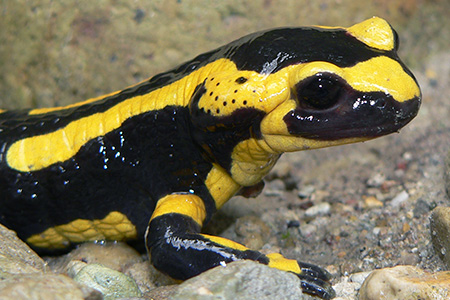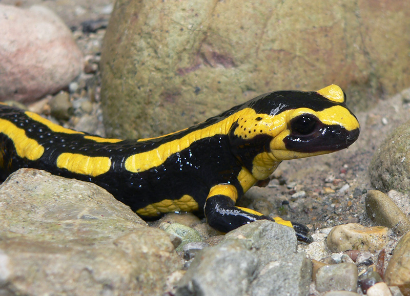 Ein reiner Landbewohner ist der Alpensalamander. Als einzige einheimische Amphibienart ist er nicht auf Gewässer angewiesen, sondern gebärt vollständig entwickelte Jungtiere. Beim Feuersalamander (Abb. 4) und bei der Geburtshelferkröte leben nur die Larven im Wasser; die erwachsenen Tiere halten sich dagegen an Land auf. Grasfrosch und Erdkröte verbringen nur während der Paarungszeit einige Tage bis Wochen im Wasser. Molche sind vergleichsweise lange im Teich zu beobachten, trotzdem macht auch bei ihnen die Landphase den grösseren Teil des Lebens aus. Nur die Wasserfrösche (Abb. 7) verbringen die meiste Zeit im Gewässer. An Land leben Amphibien meist unter Holz oder Steinen versteckt und sind nur bei Regenwetter oder in Nächten mit hoher Luftfeuchtigkeit aktiv.