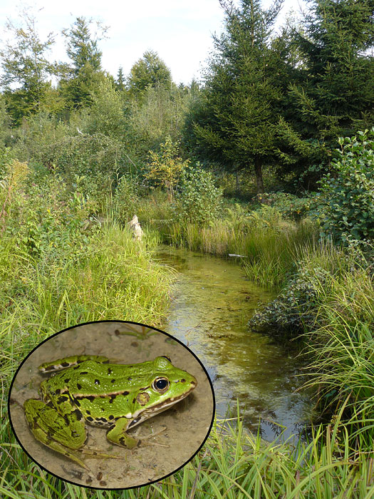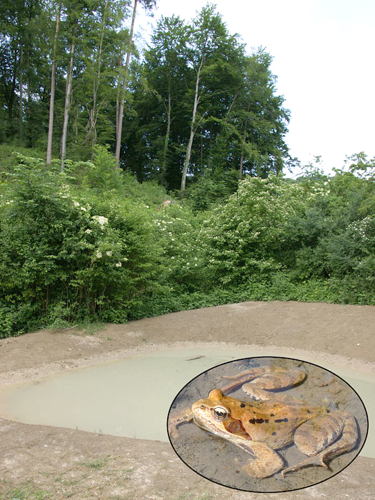 Dies alles hat zur Folge, dass Fortpflanzungsgewässer heute "Mangelware" sind und dass 70% aller einheimischen Amphibien als gefährdet gelten. Nur ein erhöhtes Angebot an Laichplätzen würde diesen Zustand verbessern. Weil der Wald als Landlebensraum von Amphibien sehr bedeutend ist, liegen arten- oder individuenreiche Laichgewässer häufig in der Nähe von Wäldern. Der Bau neuer Gewässer in Wäldern und im Waldrandbereich (Abb. 6) zeigt daher auch in den meisten Fällen Wirkung.