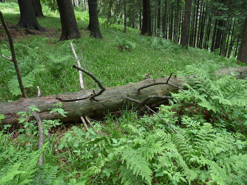 Rückzugsorte haben auch im Sommer eine grosse Bedeutung. Unter Asthaufen oder liegendem Totholz starker Dimensionen (Abb. 5) bleibt es selbst während längerer Trockenperioden feucht, was die empfindliche Amphibienhaut vor Austrocknung schützt. In einem solchen Unterschlupf sind die Amphibien zugleich vor vielen Fressfeinden sicher. Dazu zählen Eulen, Füchse, Dachse, Marder, Fische oder grosse Laufkäfer. Darüber hinaus finden Amphibien unter totem Holz, aber auch in der Oberschicht des Waldbodens und in üppiger Krautvegetation, ausreichend Nahrung – hauptsächlich Würmer, Schnecken, Asseln, Spinnen und kleinere Insekten. Innerhalb des Waldes halten sich die Lurche bevorzugt an Feuchtstellen und in Bachtälern auf.