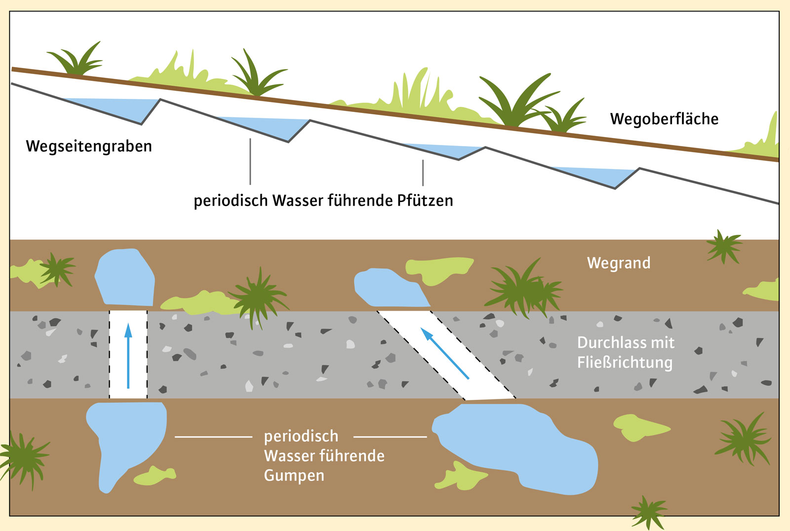Eine ähnlich positive Wirkung wird erzielt, wenn die Sohle von Wegseitengräben nicht plan, sondern strukturiert angelegt wird: im ebenen Gelände mit muldenartigen Vertiefungen bzw. Gumpen, bei leichter Neigung in Stufen und in steilerem Gelände kaskadenartig (Abbildung 5, oben). Die Dauer der Wasserführung kann dabei durch punktuelles Verdichten (z. B. mit Baggerschaufel) verlängert werden. So können kleine Wasserflächen bereitgestellt werden, die von Unken gern angenommen werden. Durch ihre perlenartige Reihung entlang von Wegen bilden sie zudem Fortbewegungskorridore und verbessern die Durchlässigkeit für Amphibienwanderungen auch in trockeneren Wäldern.
