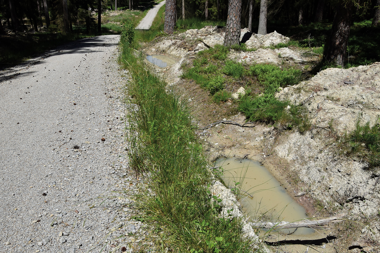 Forstwege werden in der Regel mit Gräben und Durchlässen ausgestattet. Gumpen bzw. kleine Tümpel am Ein- und Auslauf solcher Durchlässe bilden eine sehr gute Möglichkeit, Aufenthalts- und auch Laichgewässer für Amphibien zu schaffen (Abbildung 5, unten). Periodisch starker Durchfluss sorgt auf Rohböden teils jahrelang für einen vegetationsarmen Zustand, den die Gelbbauchunke braucht. Die Gumpen wirken zudem als Sedimentsammler. Bei Bedarf kann das eingeschwemmte Material mit geringem Aufwand entfernt werden.
