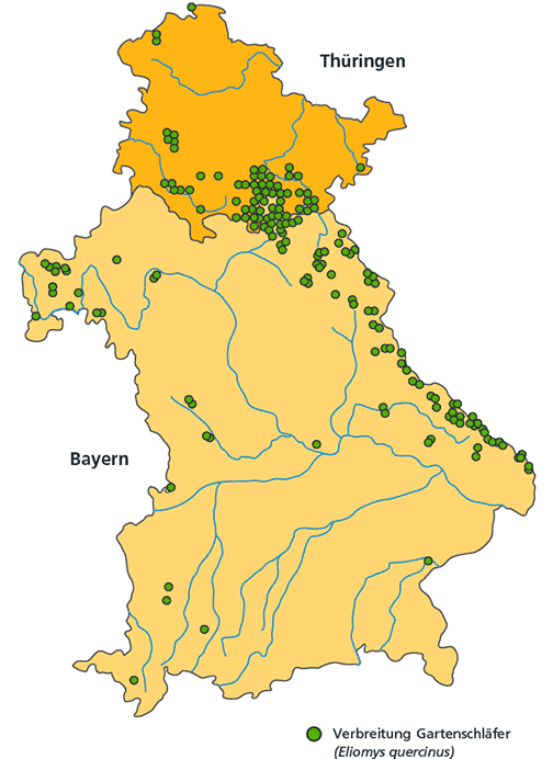 In Bayern liegt die Hauptverbreitung des Gartenschläfers in den ostbayerischen Grenzgebirgen: im Frankenwald, im Fichtelgebirge und im Bayerischen Wald. Kleinere zusammenhängende Vorkommen gibt es auch noch im Spessart und am Steigerwaldrand. Im benachbarten Thüringen kommt der Bilch im Thüringer Wald und Thüringer Schiefergebirge vor (Abb. 3).
