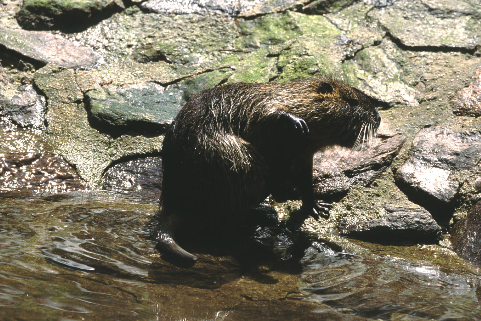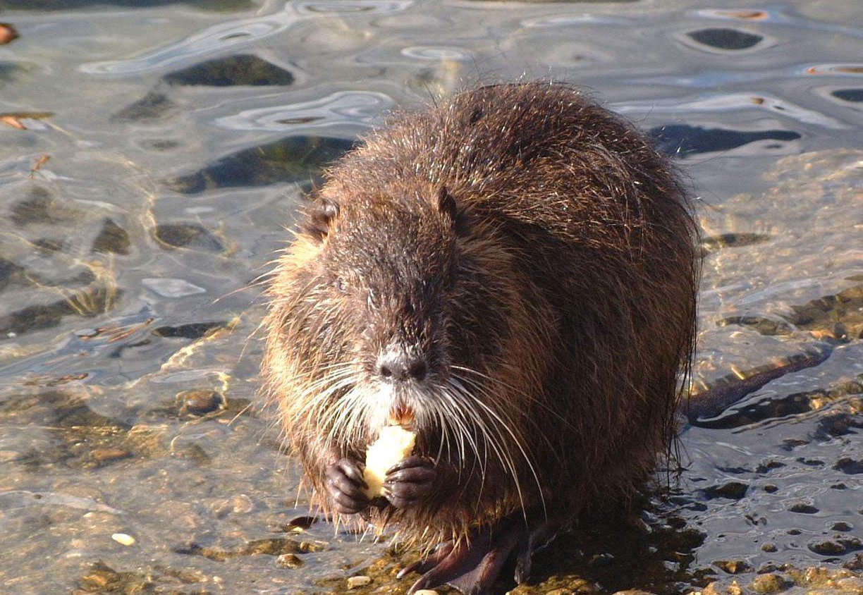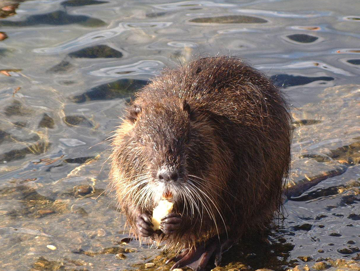 Der Nutria, auch Sumpfbiber genannt, ist deutlich kleiner als der Biber, aber größer als der Bisam. Die Art stammt aus Südamerika. Dort ist sie vom südlichen Brasilien bis nach Feuerland verbreitet. In Europa wurde der Nager zunächst seines Pelzes, aber auch seines Fleisches wegen in Farmen gezüchtet. Um Fischteiche von allzu reichem Pflanzenwachstum zu befreien, setzte man die Art dann in der Camargue in Südfrankreich aus. Der Versuch erwies sich als äußerst erfolgreich, so dass in den 70er Jahren bereits rund 30.000 Tiere gezählt wurden. Andere Aussetzungen unter klimatisch ungünstigeren Bedingungen schlugen dagegen fehl, da die Tiere strenge Winter mit gefrorenen Wasserflächen nicht überlebten. In Deutschland nahm die Geschichte des Nutrias im Elsass ihren Ausgang. Doch anders als Biber und Bisam ist der Nutria bis heute nur inselartig verbreitet. So existieren in Bayern lediglich an den Ismaninger Speicherseen, an der Isarmündung in die Donau und isaraufwärts bis Dingolfing Ansiedlungen. Obwohl der Nutria den unteren Isarabschnitt bereits länger besiedelte, konnte sich der Biber inzwischen mit 18 Revieren etablieren, ohne dass die Nutriapopulation eingebrochen wäre. Dies deutet auf eine geringe Konkurrenz der beiden Arten hin. Bisams gegenüber ist der Nutria aggressiv und kann diesen verdrängen. Doch wie lebt eigentlich der Nutria? Anders als beim Biber liegen seine Erdröhren über dem Wasserspiegel. Seine Nahrung besteht ganz überwiegend aus Wasserpflanzen wie Schilf oder Glanzgras. Hier besteht eine gewisse Konkurrenz zum Bisam.