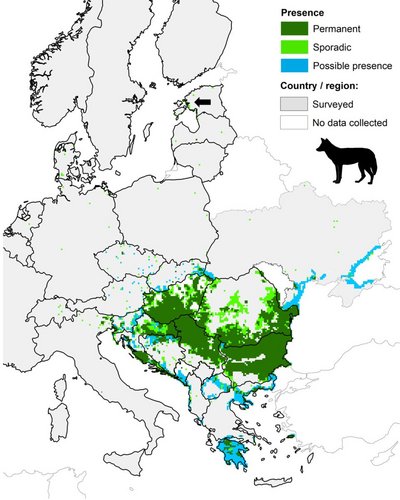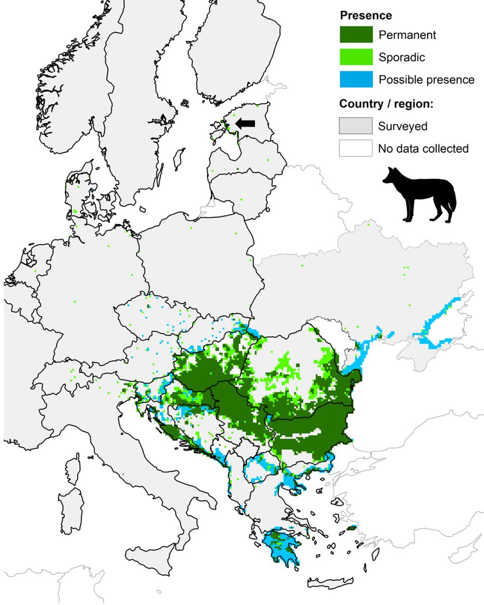 Grosse Populationen findet man in Europa auf dem Balkan zwischen Adria und Schwarzem Meer (Ungarn, Bulgarien, Serbien, Rumänien). Die westlichsten bzw. nördlichsten Vorkommen mit Reproduktion (Rudeln) befinden sich derzeit im Trentino (Italien), im östlichen Österreich (Neusiedlersee und nördlich von Graz 2007/2009/2015) sowie in Süddeutschland. Regelmässige Nachweise gibt es u.a. aus Polen, Liechtenstein, seit 2017 auch aus Frankreich.
