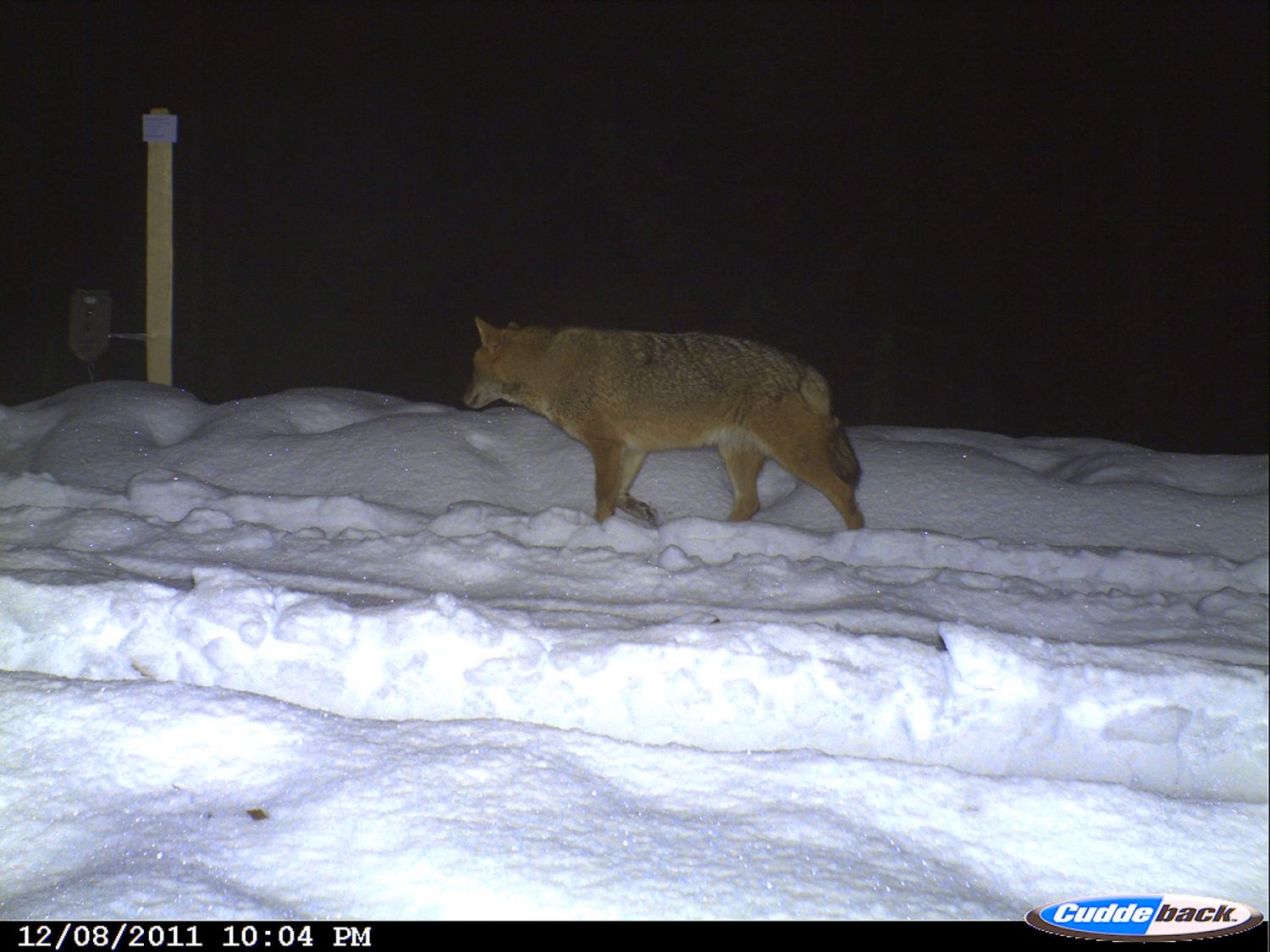Abb. 7. Das erste Foto eines Goldschakals in der Schweiz entstand während eines Luchsmonitorings in den Nordwestalpen im Winter 2011/2012. Foto: D. Combremont, J. Roch / KORA