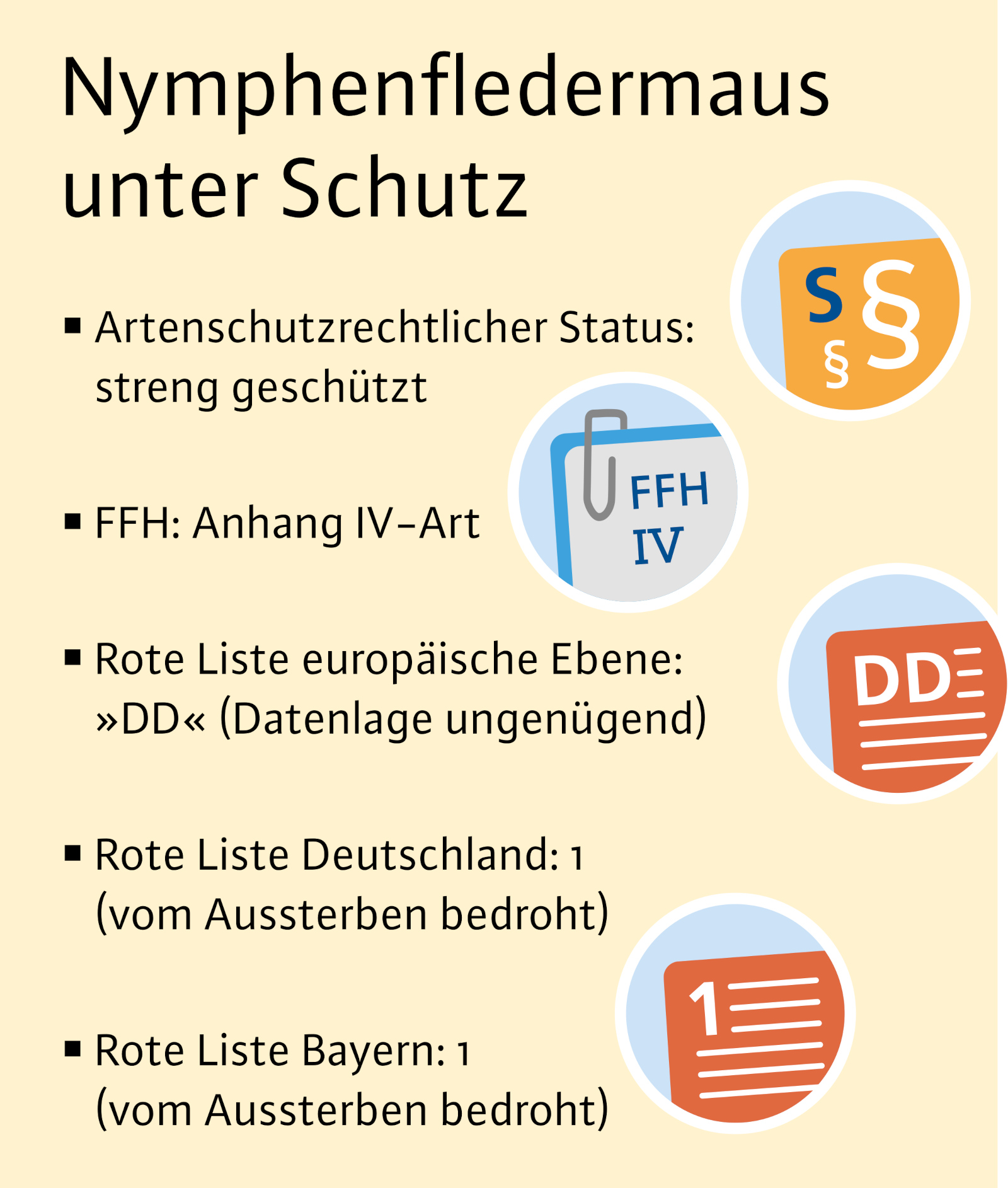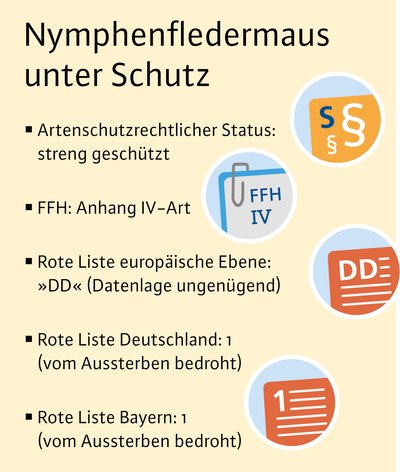 In Deutschland gilt die Nymphenfledermaus als eine der seltensten Fledermausarten. Sie lebt sehr versteckt, weshalb das Wissen über ihre Verbreitung in Bayern noch lückenhaft ist. Bisherige Untersuchungen zeigen einen Verbreitungsschwerpunkt in alten Laubwäldern Nordbayerns. Südlich der Donau fehlen Nachweise komplett – trotz intensiver Suche in als Habitat gut geeigneten Wäldern.
