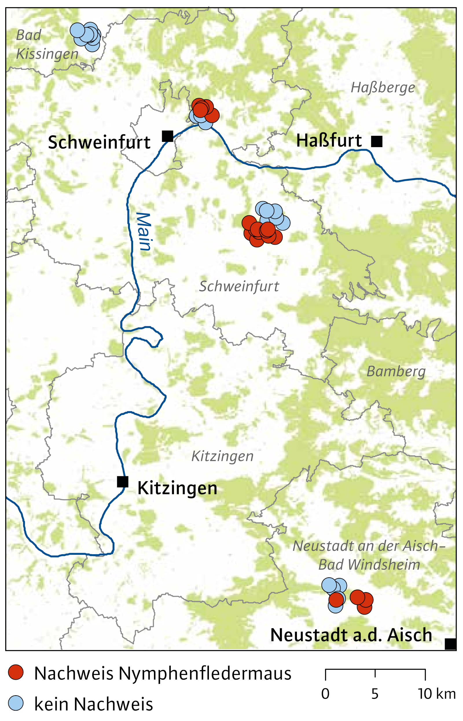 Unter anderem sollte untersucht werden, ob sich der Einsatz von Pflanzenschutzmitteln in stark vom Schwammspinner befallenen Beständen auf die Nichtzielorganismusgruppe "Fledermäuse" auswirkt. In vier Untersuchungsgebieten wurden hierfür Batcorder in insgesamt 39 Waldbeständen zur Erfassung der Fledermausaktivitäten installiert. Die Aufzeichnungen erfolgten einmal monatlich jeweils eine Nacht lang im Zeitraum April bis September. Überraschende Beibeobachtung: In drei der vier Untersuchungsgebieten, auf 19 Batcorder-Standorten, konnte die seltene Nymphenfledermaus nachgewiesen werden; und zwar auf den Flächen bei Mainberg, bei Sulzheim und nordöstlich von Ullstadt (Abbildung 3). Von allen 13 erfassten Fledermausarten wies die Nymphenfledermaus nach der Zwerg- und Mückenfledermaus die dritthöchste Gesamtaktivität (Maßeinheit: Dauer der aufgezeichneten Rufe in Sekunden) auf. Die Rufintensität an einem Standort im FFH-Gebiet "Dürrfelder und Sulzheimer Wald" nördlich von Gerolzhofen lässt sogar darauf schließen, dass sich dort vermutlich ein Wochenstubenquartier befindet.