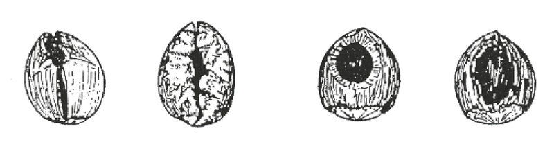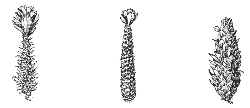 Abb. 5 - Eine ausgefaserte Zapfenspindel besagt, dass die Schuppen abgerissen wurden – vom Eichhörnchen (links). Sind die Schuppen dicht und sauber über der Spindel abgenagt, war es die Maus (mitte). Ist der Zapfen zerhackt und zerzaust und sind die Schuppen ausgedreht, stammen die Spuren aus der Spechtschmiede (rechts).