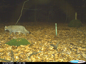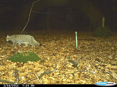Abb. 3: Mittels Fotofalle fotografierte Wildkatze in der Nähe eines Lockstockes. Foto: J. Preller