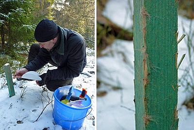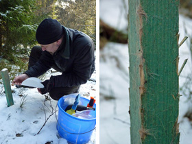 Abb. 4 und 5: Die am Lockstock verbleibenden Wildkatzenhaare werden abgesammelt (links). Rechts Wildkatzenhaare am Lockstock. Fotos: J. Preller