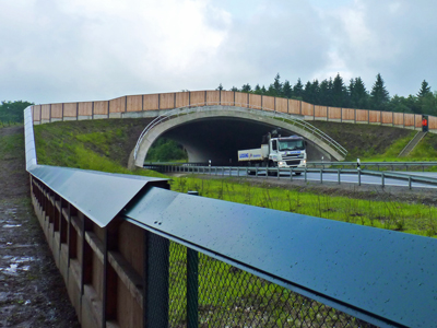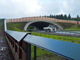 Abb. 6: Neue Wildbrücke über die B 64 zwischen Altenbeken und Bad Driburg im Eggegebirge, die auch für die Wildkatze gebaut wurde (neben Rotwild und anderen). Das Foto zeigt insbesondere den wildkatzensicheren Zaun. Sie liegt mitten im Untersuchungsgebiet. Foto: J. Preller