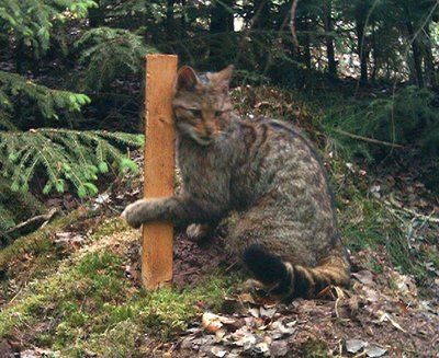 Als Lockstöcke dienen sägeraue Dachlatten, die in den Boden gesteckt werden. Der überirdisch liegende Teil (etwa 50 Zentimeter) wird mit Baldriantinktur besprüht. Der Baldrian lockt die Katzen an, die sich dann am Lockstock reiben. Dabei bleiben einige Haare an der rauen Latte hängen (Abb. 2). Bei Kontrollen werden diese Haare abgesammelt, der Lockstock abgeflammt und erneut mit Baldrian besprüht.