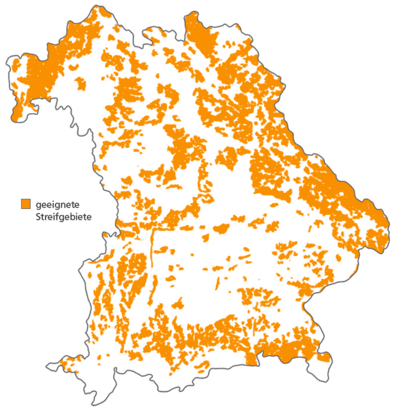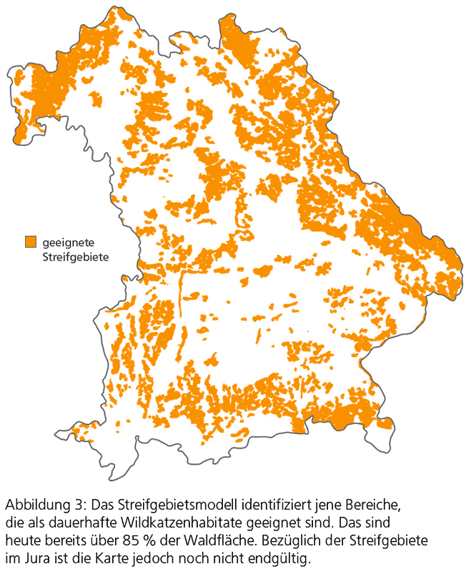 Bayern wurde einer Habitatanalyse unterzogen, um festzustellen, wo es der Wildkatze hier zusagen würde. Dazu wurde ganz Bayern in kleine Bereiche unterteilt und diese auf Wildkatzen-Eignung hin untersucht. Da die Wildkatze Lebensräume von etwa 900 Hektar Größe besiedelt, wurden gut geeignete Flächen mit den umliegenden Waldflächen zu sogenannten Steifgebieten zusammengeführt (Abb. 3). Die Habitatkarte ist für den Bereich des Jura noch als vorläufig anzusehen. Dort würde es zwar gute Habitate geben, es fehlt aber Wasser – mit dessen Vorkommen die Wildkatze in der Eifel oft verknüpft ist.