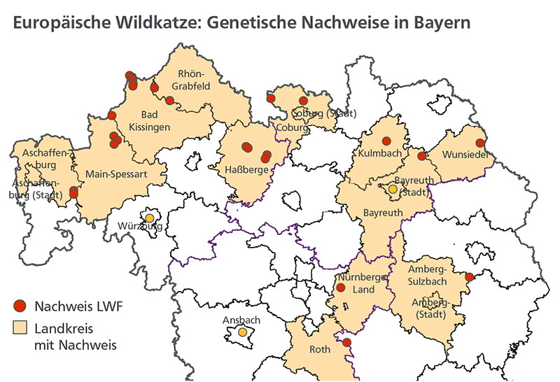 Bei Umfragen zur Wildkatze kamen die meisten Meldungen aus Spessart und Rhön, vereinzelt aber auch aus dem übrigen Bayern. Ausgehend von diesen Ergebnissen wurden in Nord- und Ostbayern 17 Landkreise ausgewählt, in denen in zwei aufeinanderfolgenden Jahren ein systematisches Lockstockmonitoring durchgeführt wurde.