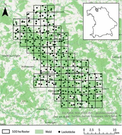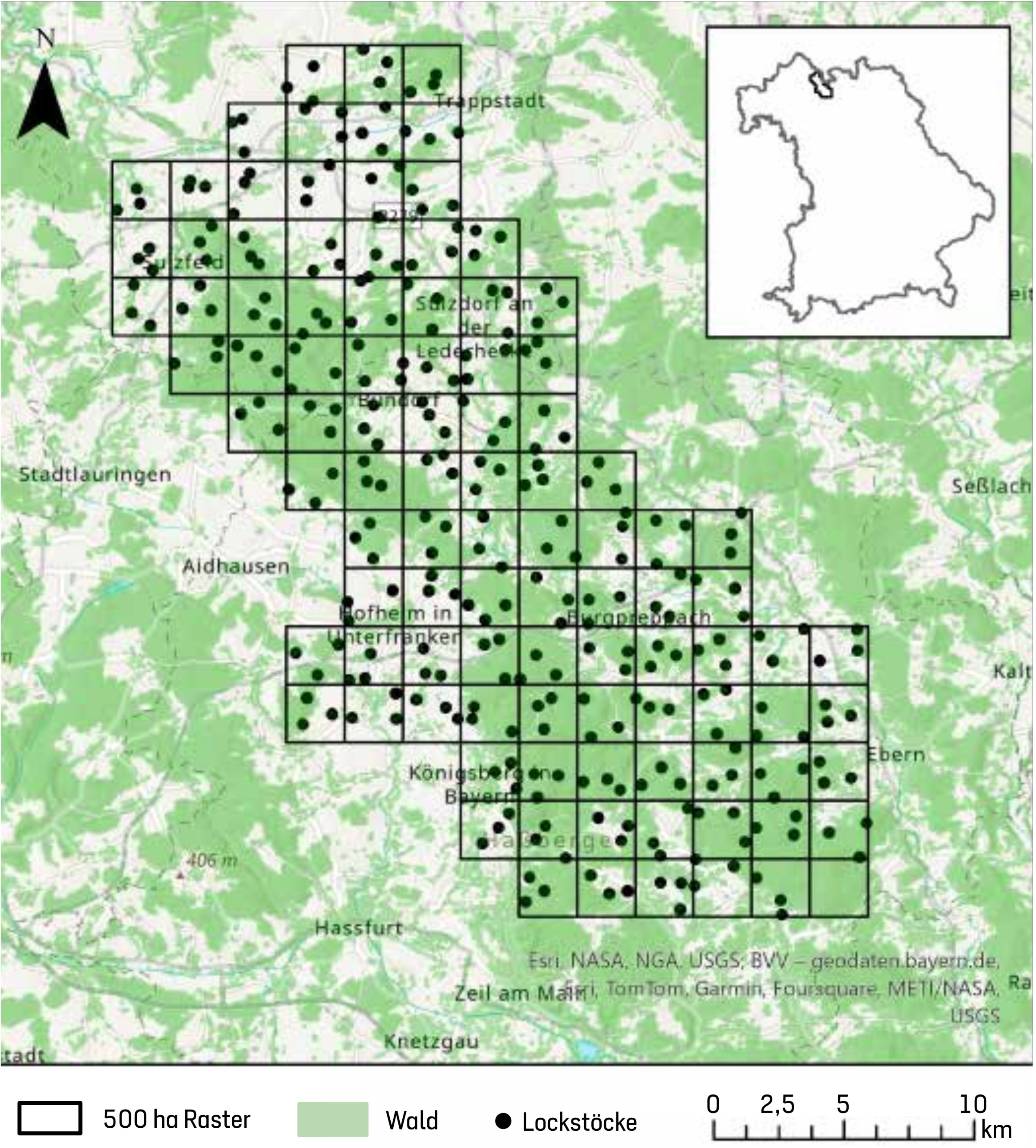 Abb. 2: Übersichtskarte des Projektgebiets in den Haßbergen, die Waldgebiete sind in Dunkelgrün dargestellt. In jedem der 500 ha großen Beprobungsraster wurden drei Lockstöcke aufgestellt (Punkte). Lockstöcke wurden dabei gezielt an geeigneten Stellen in Offenlandbereichen platziert (helle Bereiche).
