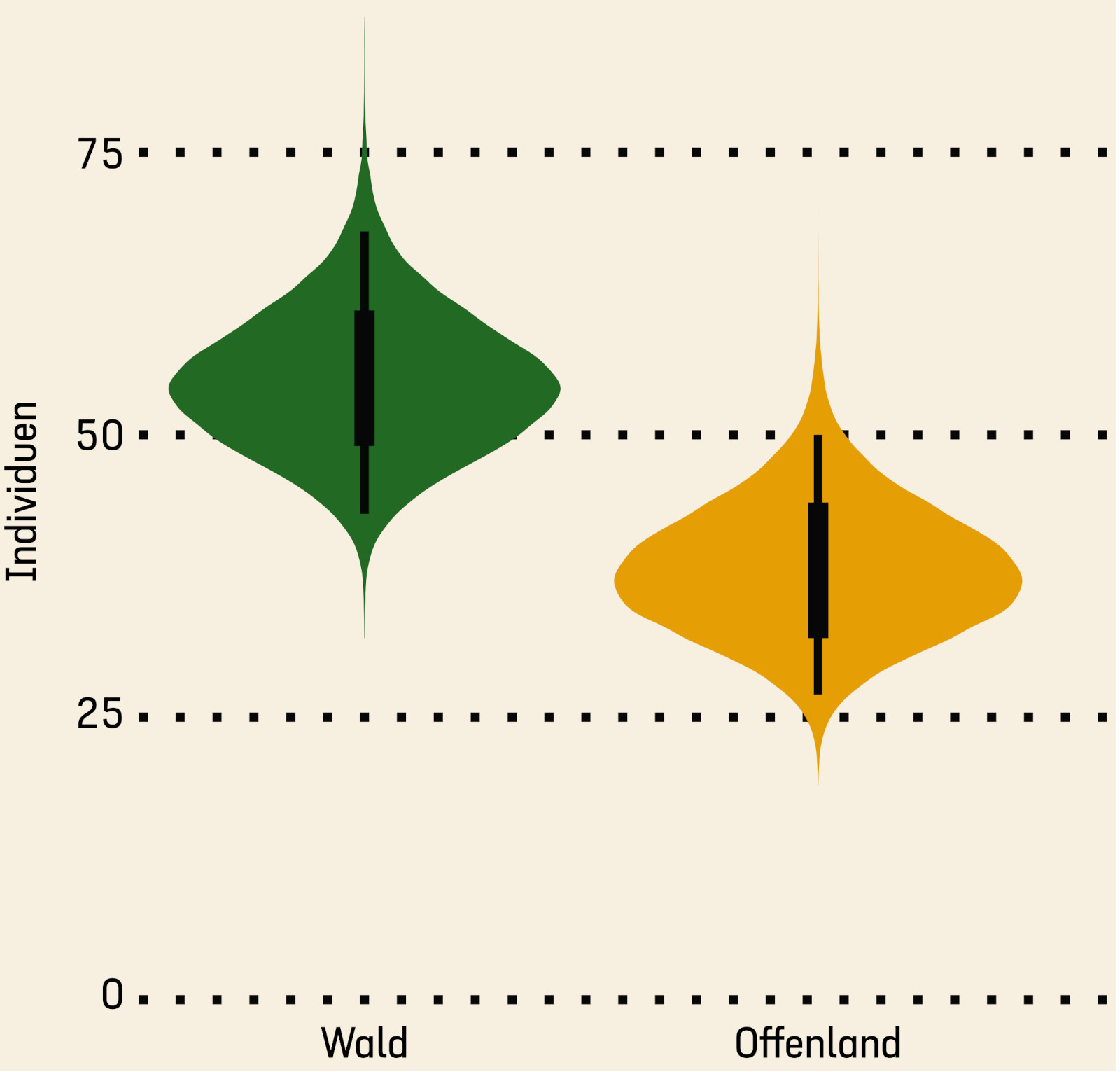 Betrachtet man die Dichte der Wildkatzen nach Wald und Offenland getrennt, so ergibt sich – wie erwartet – eine höhere Wildkatzendichte im Wald: 0,25 versus 0,14 Individuen/100ha im Offenland. Dies entspricht einer geschätzten Anzahl von 54 Wildkatzen, die ihren Aktivitätsschwerpunkt im Wald hatten, und 38 Wildkatzen, die ihren Aktivitätsschwerpunkt im Offenland hatten (Abb. 3). Mit zunehmendem Waldanteil (höherer Kronendichte) erhöhte sich die Wahrscheinlichkeit, dass in solchen Bereichen die Aktivitätszentren der Wildkatzen liegen und die Dichte dort höher ist.