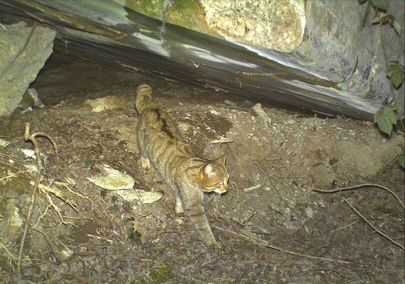 Abb. 4: Die typischen Wildkatzenmerkmale wie der Aalstrich und der dicke buschige Schwanz sind auf diesem Wildkamerafoto eindeutig zu erkennen. (Foto: FVA)