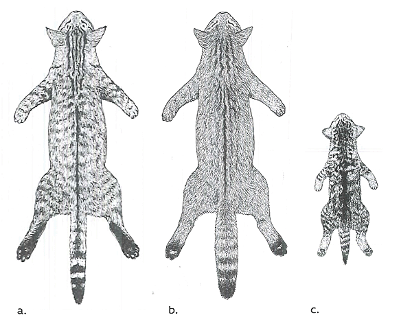 Abb. 3: Vergleich der phänotypischen Merkmalen zwischen Hauskatze (a), adulter Wildkatze (b) und juveniler Wildkatze (c) (Zeichnung von Franz Müller in Müller et al 2011).