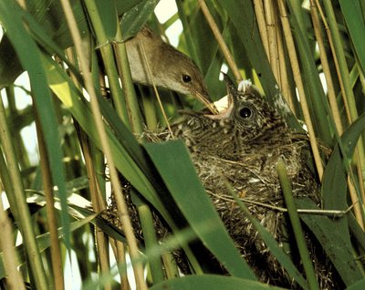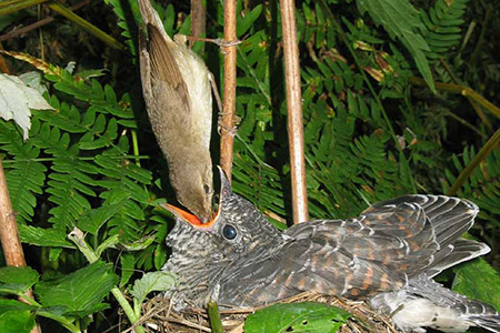Die Kost geben den jungen Kuckucken natürlich die jeweiligen Ersatzeltern vor. Allerdings fordern die Jungen die gewünschte Nahrungsmenge vehement ein, indem sie ihren signal-orangeroten Rachen weit aufsperren. Die starke Reizwirkung zum Füttern kann ihre Versorger bis an deren Leistungsgrenze bringen. Nahrungs-Konkurrenz durch Geschwister braucht der "kleine" Schmarotzer aber nicht zu fürchten. In den ersten Tagen schiebt der Nestling jedes Ei und jeden Jungvogel rücklings aus dem Nest.