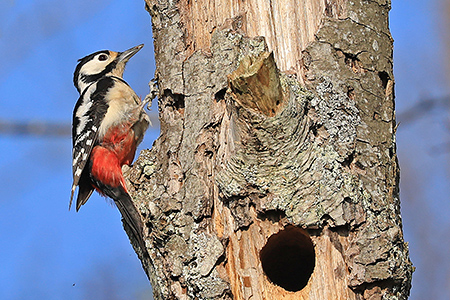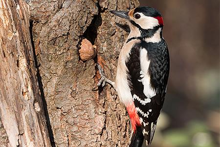 Die erste deutsche Blutspecht-Dokumentation deckt sich mit der Vorhersage europäischer Ornithologen. Demnach ist der Specht eine wärmeliebende Art, die sich in den nächsten Jahrzehnten von Südosteuropa nördlich und westlich nach Mitteleuropa ausbreiten wird. Nicht weit entfernt gibt es bereits Brutnachweise in Tschechien. Ein wichtiges Bestimmungsmerkmal für den Blutspecht kann jeder Vogelfreund ganz einfach selbst erkennen: Im Gegensatz zum Buntspecht fehlt beim Blutspecht der schwarze Zügelstreifen zum Nacken. Zudem ist der Steißbereich weniger rot gefärbt, die Flanken sind leicht gestrichelt und die äußeren Steuerfedern überwiegend schwarz gefärbt mit nur wenig weiß.