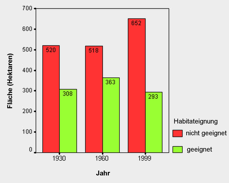 Das statistische Modell wurde anschliessend verwendet, um die Entwicklung des geeigneten Lebensraums zwischen 1930 und 1999 zu quantifizieren. Danach hat die geeignete Habitatfläche in diesem Zeitraum trotz Zunahme der Waldfläche (+7%) leicht abgenommen (−5%) (Abb. 3).