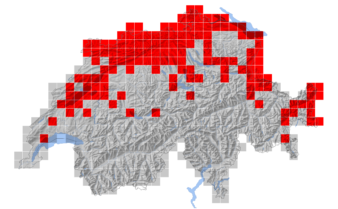 Abb. 2 - Verbreitung des Grauspechts in der Schweiz (2013–2016). Quelle: Schweizerische Vogelwarte