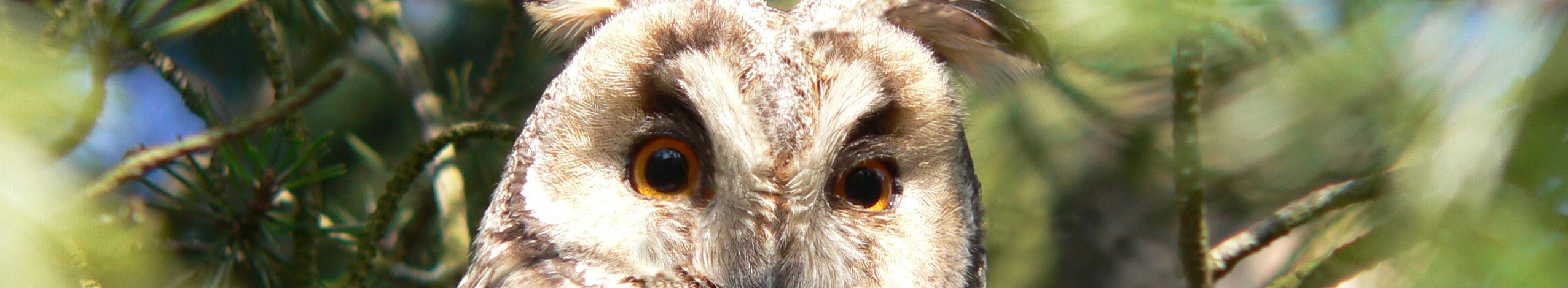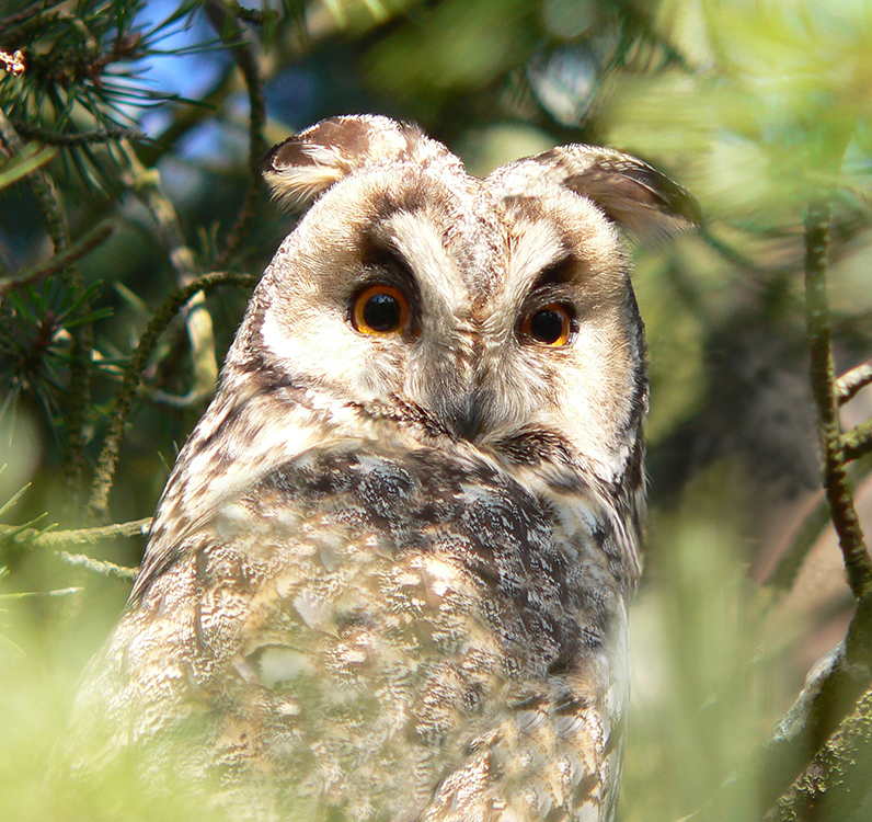 Abb. 2 - Tagsüber ruht die Waldohreule gerne in Nadelbäumen, die ihr ausreichend Deckung bieten. Entgegen der landläufigen Meinung haben die auffälligen Ohrpinsel, denen die Waldohreule ihren Namen verdankt, nichts mit dem Gehör zu tun. Die verlängerten Kopffedern sind reines "Schmuckwerk".