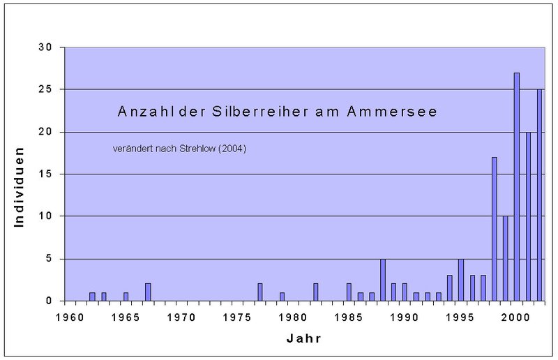 Ein typisches Beispiel hierfür ist die Zunahme der "weissen Reiher" in jüngster Zeit besonders in Südbayern, allen voran der Silberreiher (Casmerodius albus), gefolgt vom Seidenreiher (Egretta garzetta) und dem kleinen Kuhreiher (Bubulcus ibis). Dies kann nicht allein mit der Klimaerwärmung begründet werden, denn gleichzeitig treten an den Gewässern vermehrt auch Arten aus dem hohen Norden, wie z. B. Gänsesäger (Mergus merganser), Eisente (Clangula hyemalis) und seit 1977 auch Eistaucher (Gavia immer) auf (Langenberg 2004).