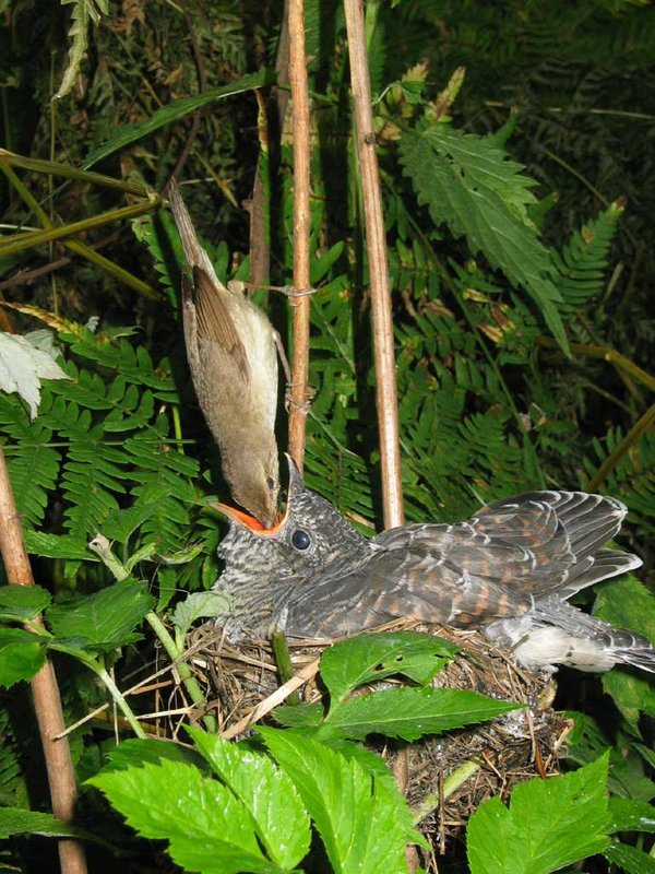 Abb. 1 - Nimmersatt: Ein junger Kuckuck lässt sich von seiner "Stiefmutter" füttern.