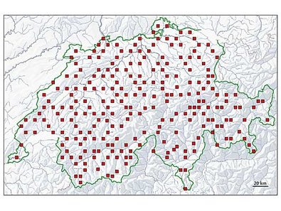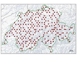 Im Programm "Monitoring Häufige Brutvögel" (MHB) der Schweizerischen Vogelwarte werden seit 1999 jedes Jahr auf 267 Kilometerquadraten in der ganzen Schweiz die Brutvögel gezählt (Abb. 5). Vorläufer des MHB war das Programm der "Ornithologischen Jahresübersichten" (JÜB), das ab 1984 ebenfalls Daten zur Bestands-entwicklung weitverbreiteter Arten lieferte. Mit den Daten dieser Monitoringprogramme können für die allermeisten Vogelarten der Schweiz ab 1990 verlässlich Populationstrends berechnet werden.