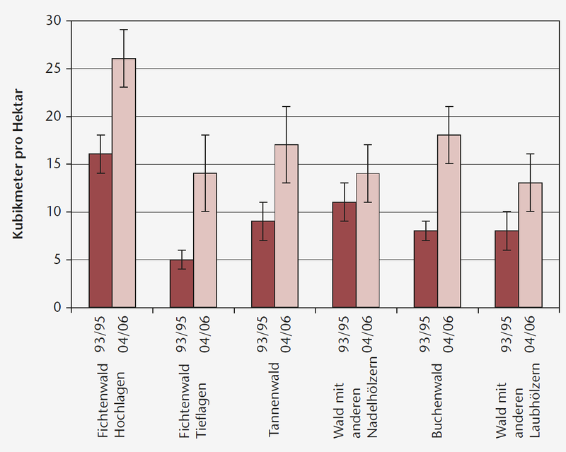 Für die Landesforstinventare (LFI) II und III wurden in den Jahren 1993 bis 1995 (LFI II) bzw. 2004 bis 2006 (LFI III) Daten erhoben, unter vielen anderen auch der Totholzvorrat. Eine Spezialauswertung der Eidgenössischen Forschungsanstalt WSL zeigt die Totholzvorräte, aufgeschlüsselt auf 6 verschiedene Waldtypen (Abb. 6). In allen Waldtypen hat der Vorrat an Totholz im Zeitraum zwischen den Aufnahmen für das LFI II und das LFI III zugenommen, in den meisten zudem sehr deutlich.