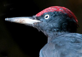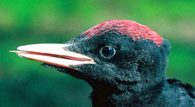 Abb. 3. Beim Männchen des Schwarzspechtes ist der ganze Scheitel vom Schnabel bis zum Nacken rot gefärbt. Weibchen besitzen lediglich einen roten Nackenfleck (siehe Abb. 2). Foto: Josef Senn (WSL)