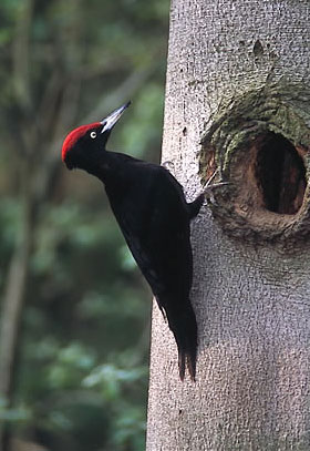 Abb. 8. Männlicher Schwarzspecht am Höhleneingang.Foto: Steffen Hannert (Wikipedia)