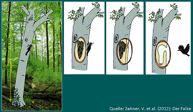 Die enge Beziehung von Spechten zu Tot- und Faulholzstrukturen ist seit vielen Jahren bekannt. Kontrovers wird allerdings diskutiert, inwieweit der Schwarzspecht auf Fäulen beim Höhlenbau in der Buche angewiesen ist. Die Bäume, in denen er seine Höhlen anlegt, sind überwiegend vitale Bestandsglieder. Ob sich hinter der äußerlich vitalen Erscheinung eine Kernfäule befindet, lässt sich in der Regel nicht erkennen. Kontrolliert man fertige Höhlen des Schwarzspechts, entdeckt man häufig Fäuleansätze. Aber kam die Fäule mit dem Specht? Oder wählte der Specht den kernfaulen Stamm gezielt zur Höhlenanlage aus?
