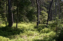 Abb. 4 - Lebensraumelemente für das Auerhuhn - tiefastige Fichten werden gerne als Versteck benutzt. Die Heidelbeere bietet Nahrung vom Frühling bis in den Herbst und ist zugleich Lebensraum für viele Insekten, welche für die Küken in den ersten Lebenswochen die Hauptnahrung bilden.